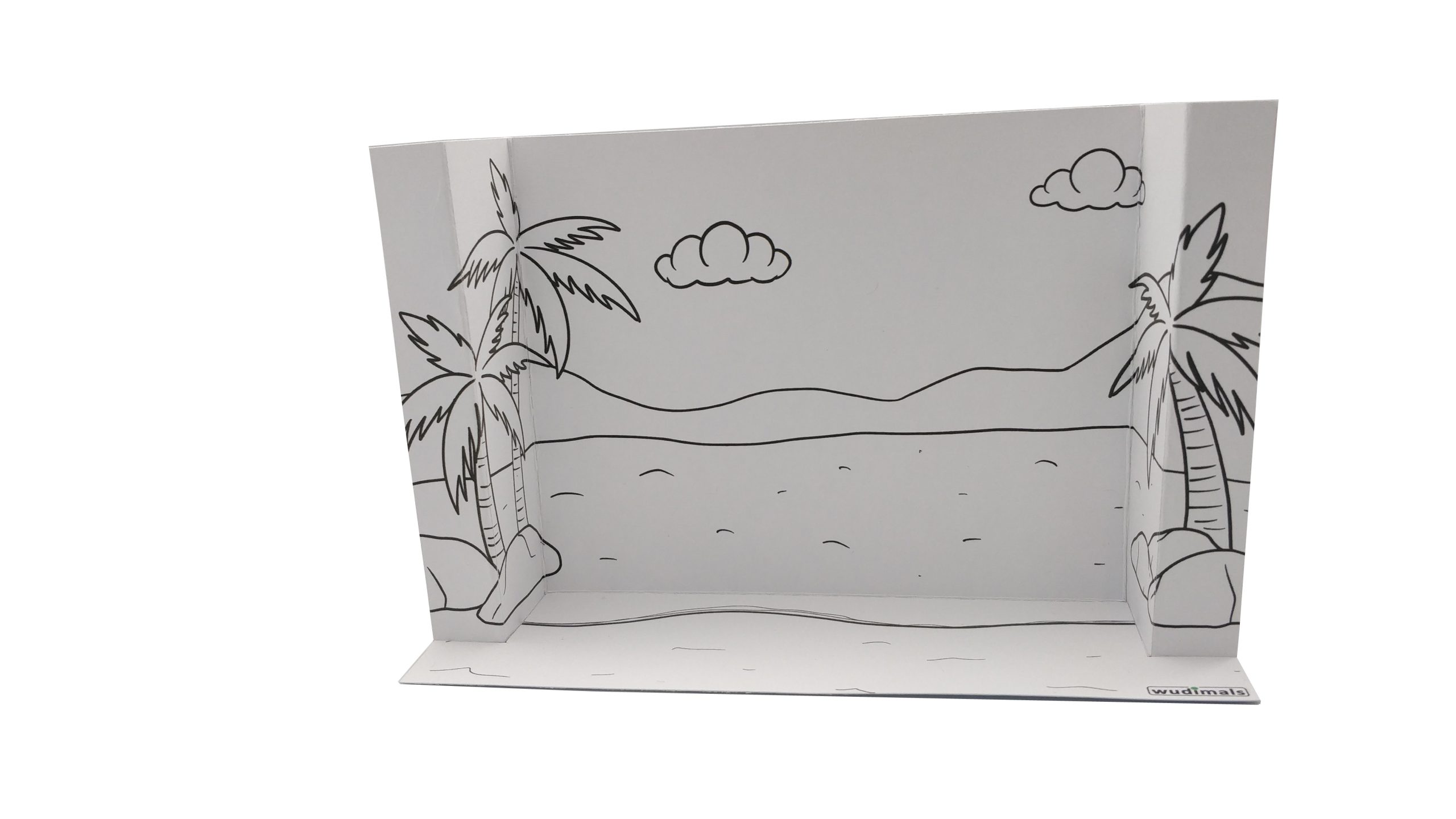 | For download only | If you have purchased a wudimal, this beautiful beachscape diorama is free to download and make with your child. Use as a backdrop to our unique hand carved and hand painted Wudimals®. When you place an order for Wudimals® you will receive a coupon code which will make this product free of charge on checkout. This black and white version is for your little one to colour in and then cut out, fold and glue. Alternatively you can download one of the colour versions which just require cutting, folding and gluing. |