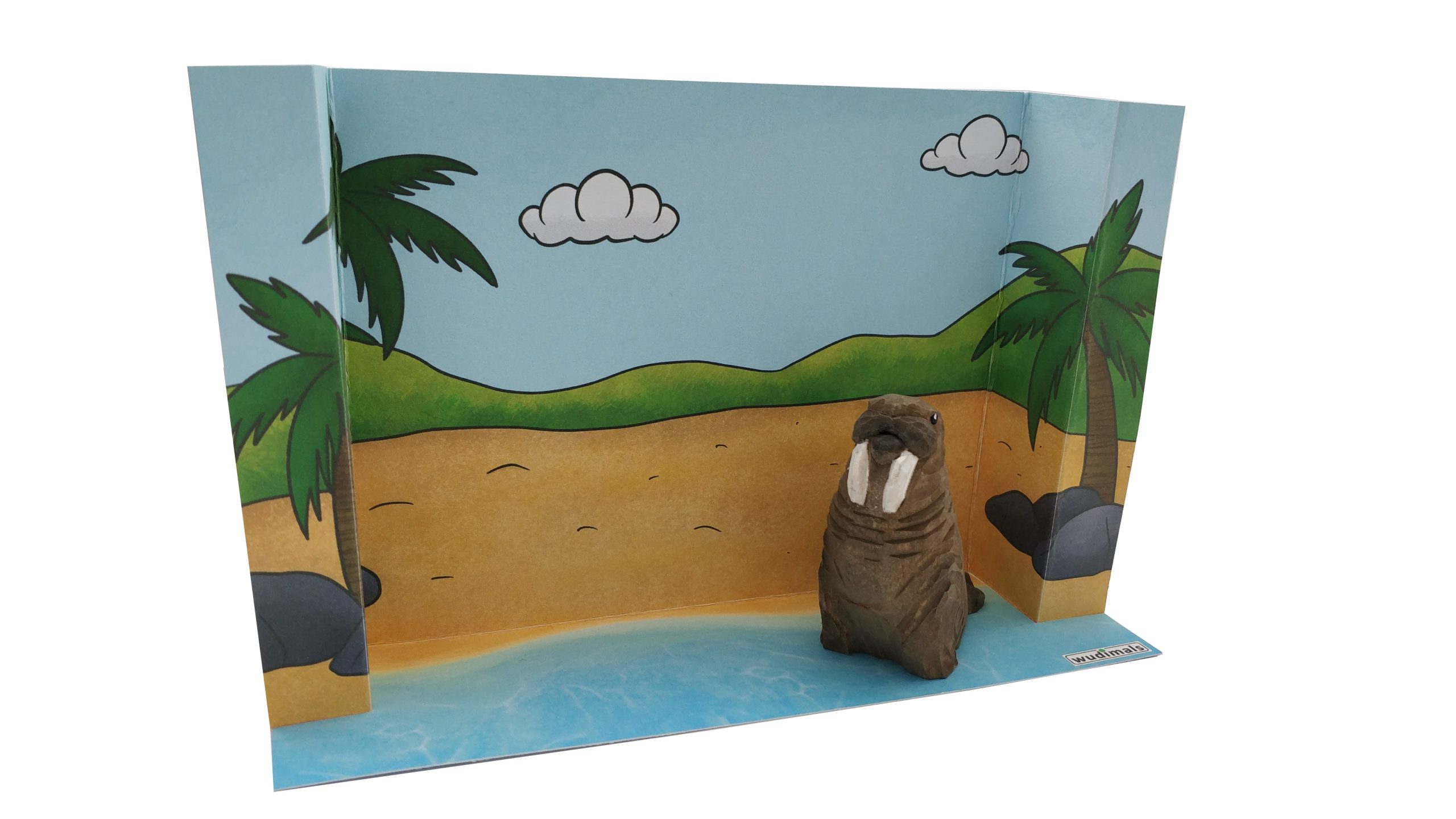 | For download only | If you have purchased a wudimal, this beautiful beachscape diorama is free to download and make with your child. Use as a backdrop to our unique hand carved and hand painted Wudimals®. When you place an order for Wudimals® you will receive a coupon code which will make this product free of charge on checkout. Take the time to cut out, fold and glue with your little one. Alternatively look at our black and white version for your little one to colour in and then cut out, fold and glue. |